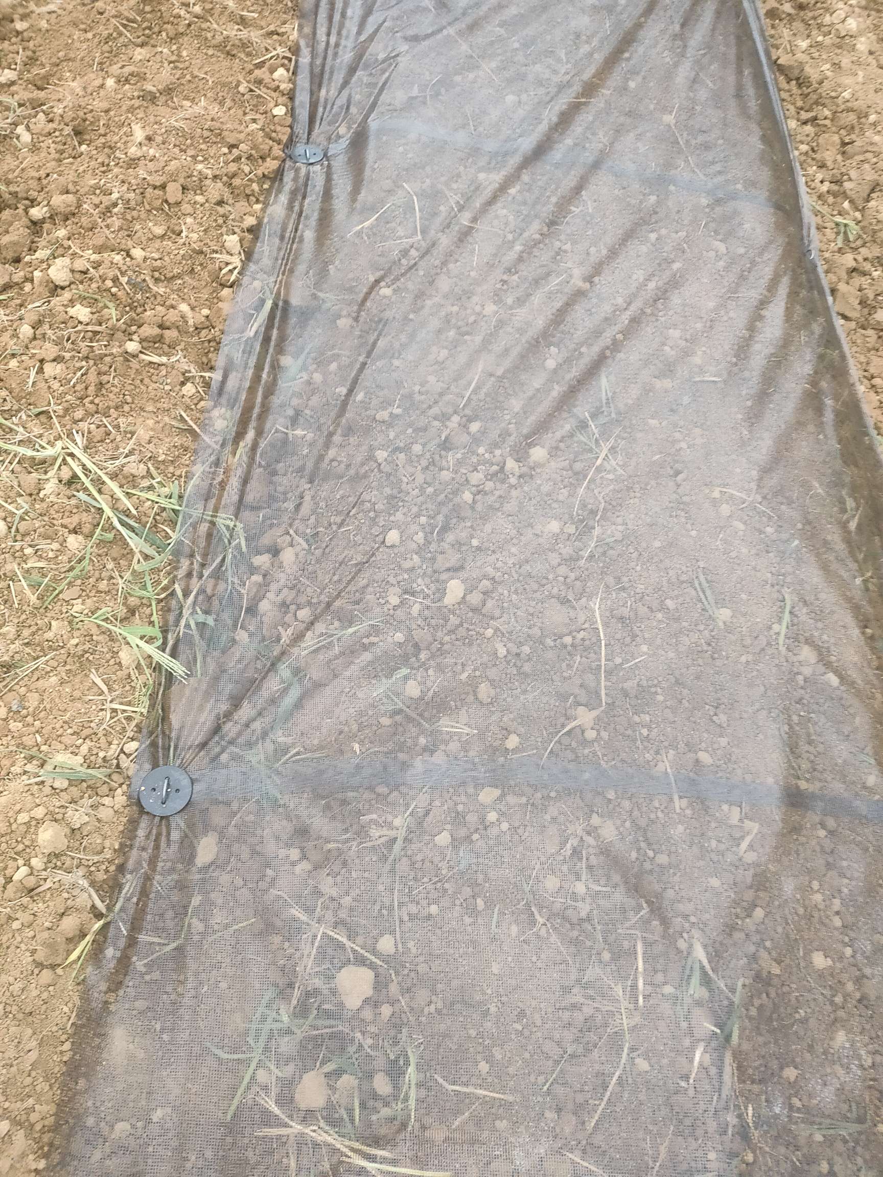 ・オクラの発芽までの……この場合は白い一般的な不織布のほうが、地温を上げて獣害予防にも効果がありそう。