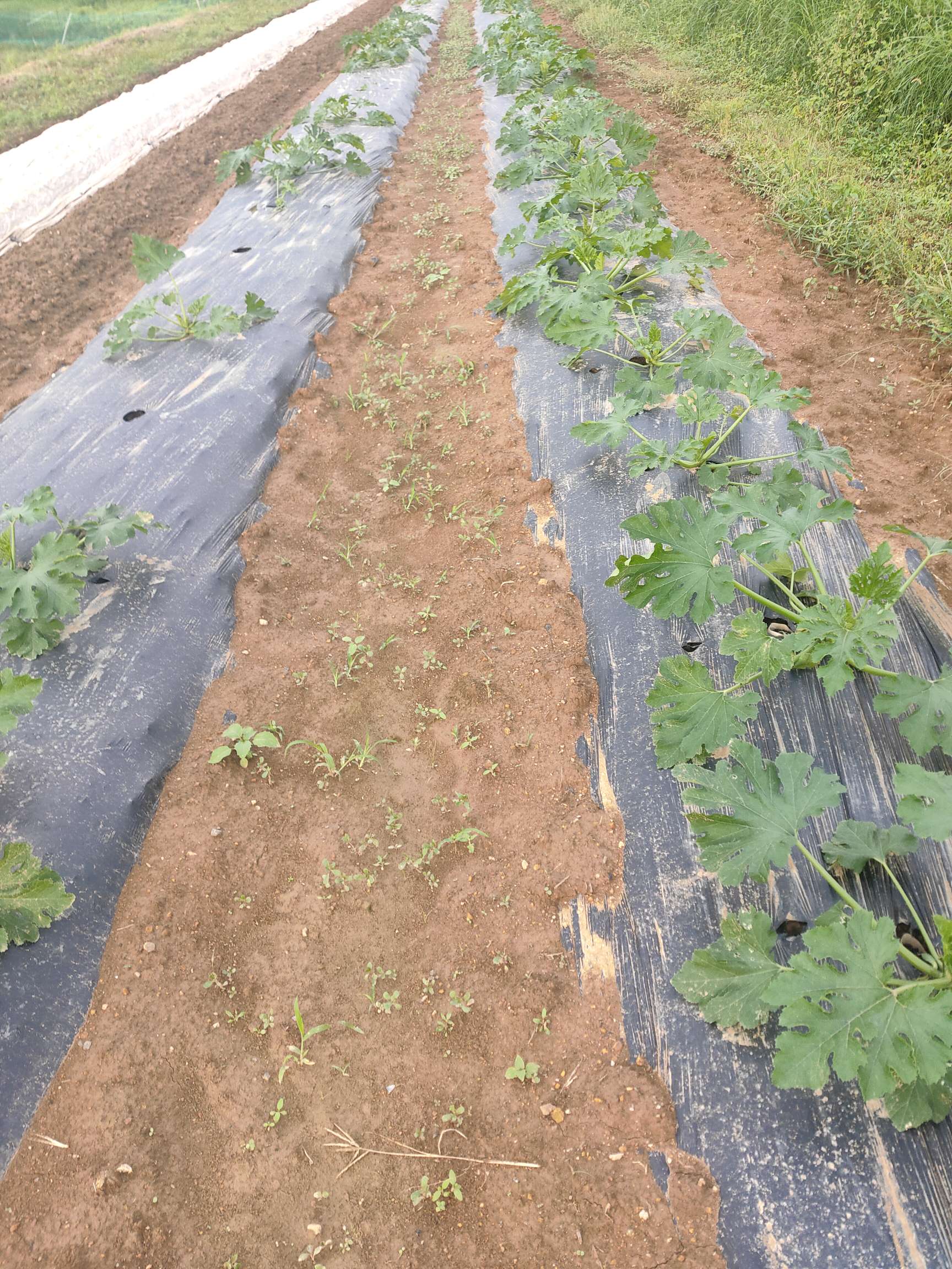 ズッキーニ。ぼちぼち花が咲きそうです。左側の一列があきらかに定着率がわるいんですが、夏の移植栽培は春とちがって成績がわるそうです。